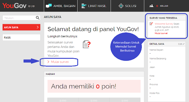 4. Bagi saya pribadi, ketika awal mendaftar survey online Bahasa Indonesia yougov, survey yang diberikan memiliki imbalan yang kecil yaitu sekitar 50-100 poin saja.